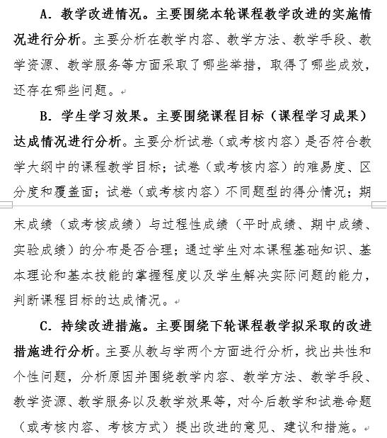 4) 成绩分析表,对学生成绩情况进行定性分析,围绕教学改进情况、学生学习效果、持续改进措施等三个方面进行分析(详见《课程考核通知》)。