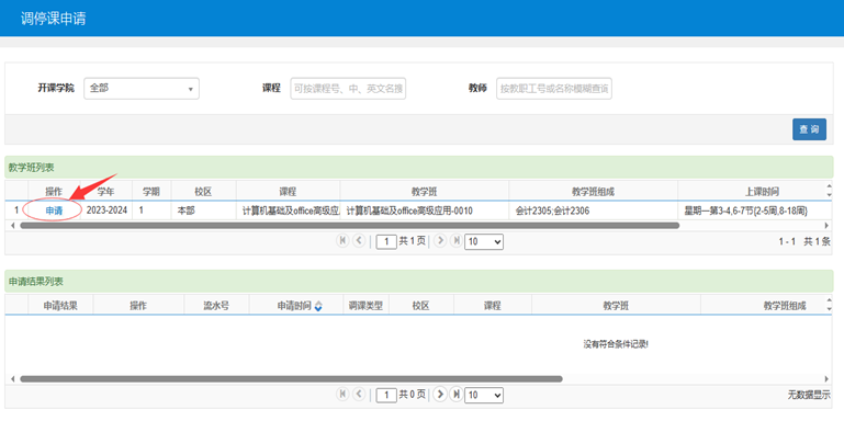 (二)进入调停课申请界面后,选择要调的教学班 点击左侧的申请