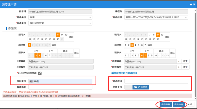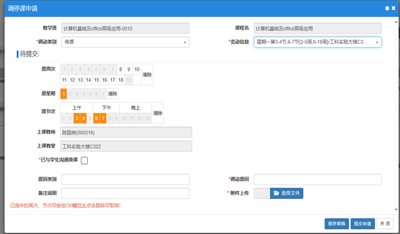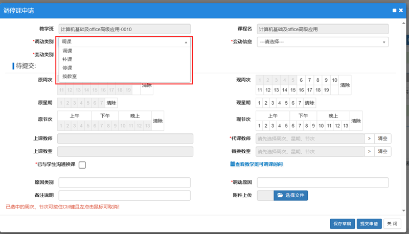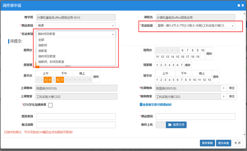 (1)选择调动类别为“停课”,选择变动信息(上课时间,周次及节次)。