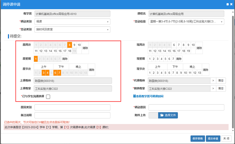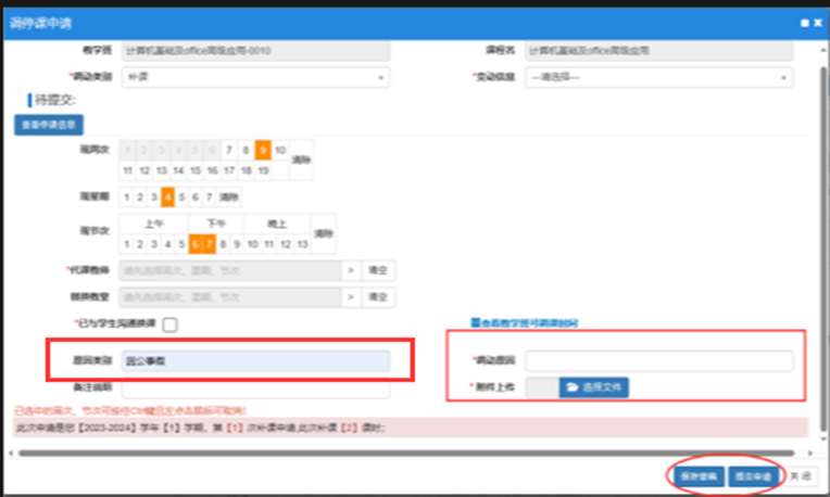 (2)填写调课的原周次、原星期、原节次等上课信息。