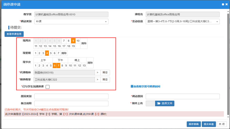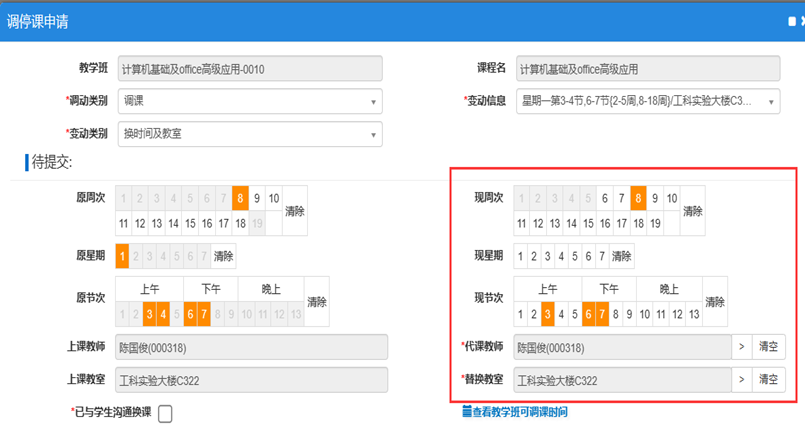 (3) 填写要补的周次、星期、节次、代课教师、替换教室等上课信息(点击查看教学班可调课时间可以查看该教学班可以补课的时间段)。