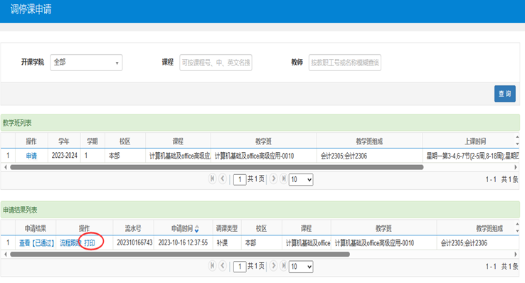 (三)任课教师网上打印审批通过的“调(停)课申请表”,由所在教学班第一行政班班长签字确认后送教务处和开课学院各一份保存。