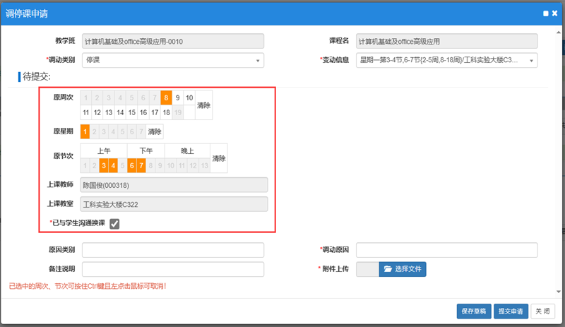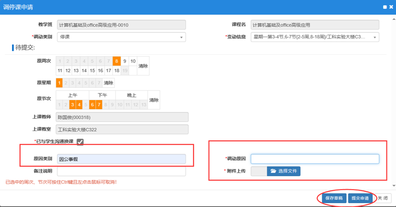 (2) 填写停课的原周次、原星期、原节次等上课信息。