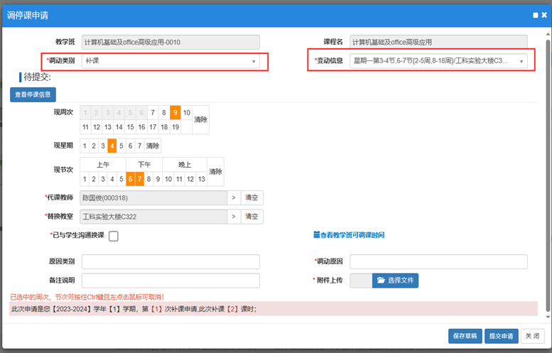 (1)选择调动类别为“补课”,选择变动信息(上课时间,周次及节次)。
