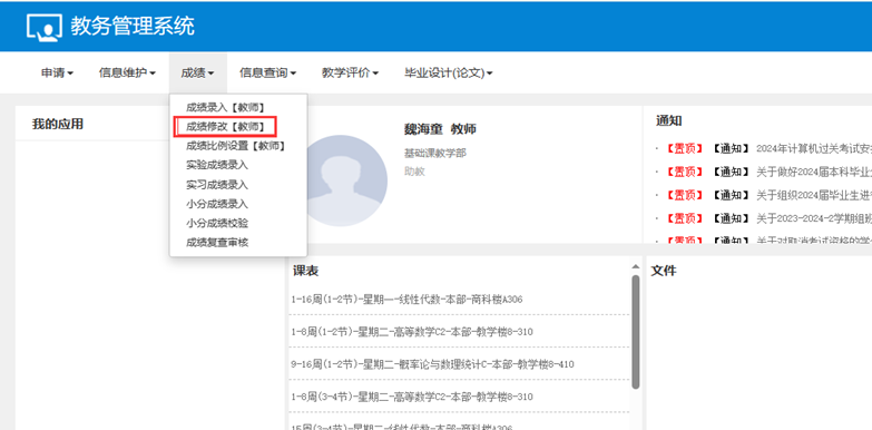 (2)进入成绩修改【教师】页面,在需要修改成绩的教学班前面点击“申请“。