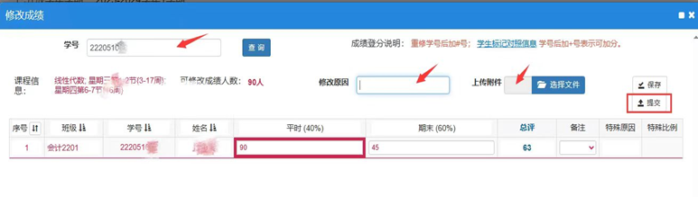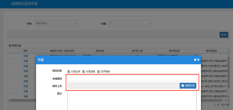 (4)如实填写成绩修改原因,并将与学生成绩相关的试卷、上课记录等证明材料进行扫描或拍照作为附件上传后提交;