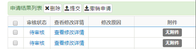 如果存在误操作记录,可以选中记录,点击撤销申请-当审核状态变成保存时-点击删除就可以删除这条申请记录。