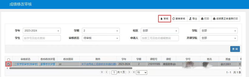 2.开课单位审核。开课单位分管教学院长严格审查任课教师的成绩修改申请是否符合学校规定,并审核上传的证明材料是否符合要求,及时审批。