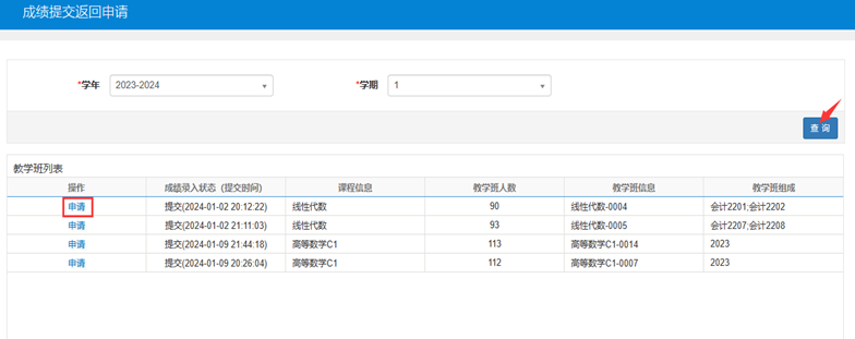 (2)进入成绩修提交返回申请页面,点击查询并在需要返回的教学班前面点击“申请“。