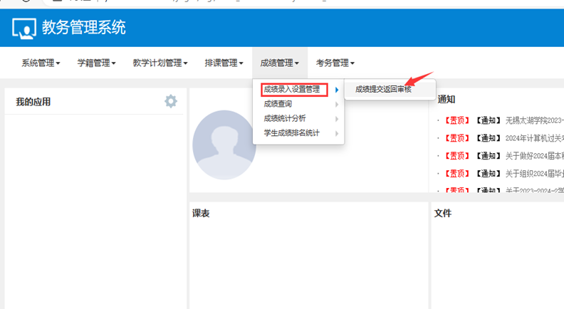 (2)选择成绩管理-成绩录入设置管理-成绩提交返回审核,如下图所示。