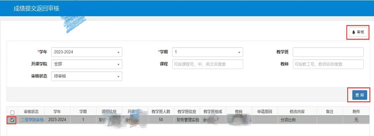(3)进入成绩提交返回审核页面,点击查询,在待审核信息前面的方框里打勾,点击上方的审核按钮,如下图所示。