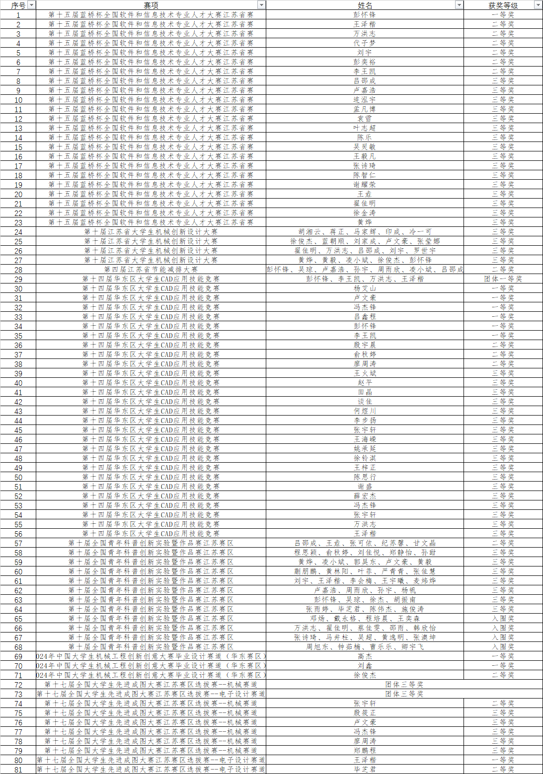 我院组织学子参与了第十届江苏省机械创新设计大赛、第四届江苏省节能减排大赛、第十届全国青年科普创新实验暨作品大赛江苏赛区、第十四届华东区大学生CAD应用技能竞赛、第十五届蓝桥杯全国软件和信息技术专业人才大赛江苏省赛、2024年中国大学生机械工程创新创意大赛毕业设计赛道(华东赛区)、第十七届全国大学生先进成图大赛江苏赛区选拔赛七项比赛。我校学子共获得团体一等奖一项、个人一等奖十项、二等奖十四项、三等奖五十二项、入围奖四项,学校获优秀组织奖一项。