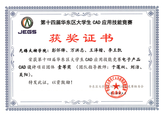 其中在第十四届华东区大学生CAD应用技能竞赛中,由我院彭怀锋、李王凯、万洪志、王泽楷四位同学组成的团队荣获电子设计CAD赛项团体一等奖第一名。
